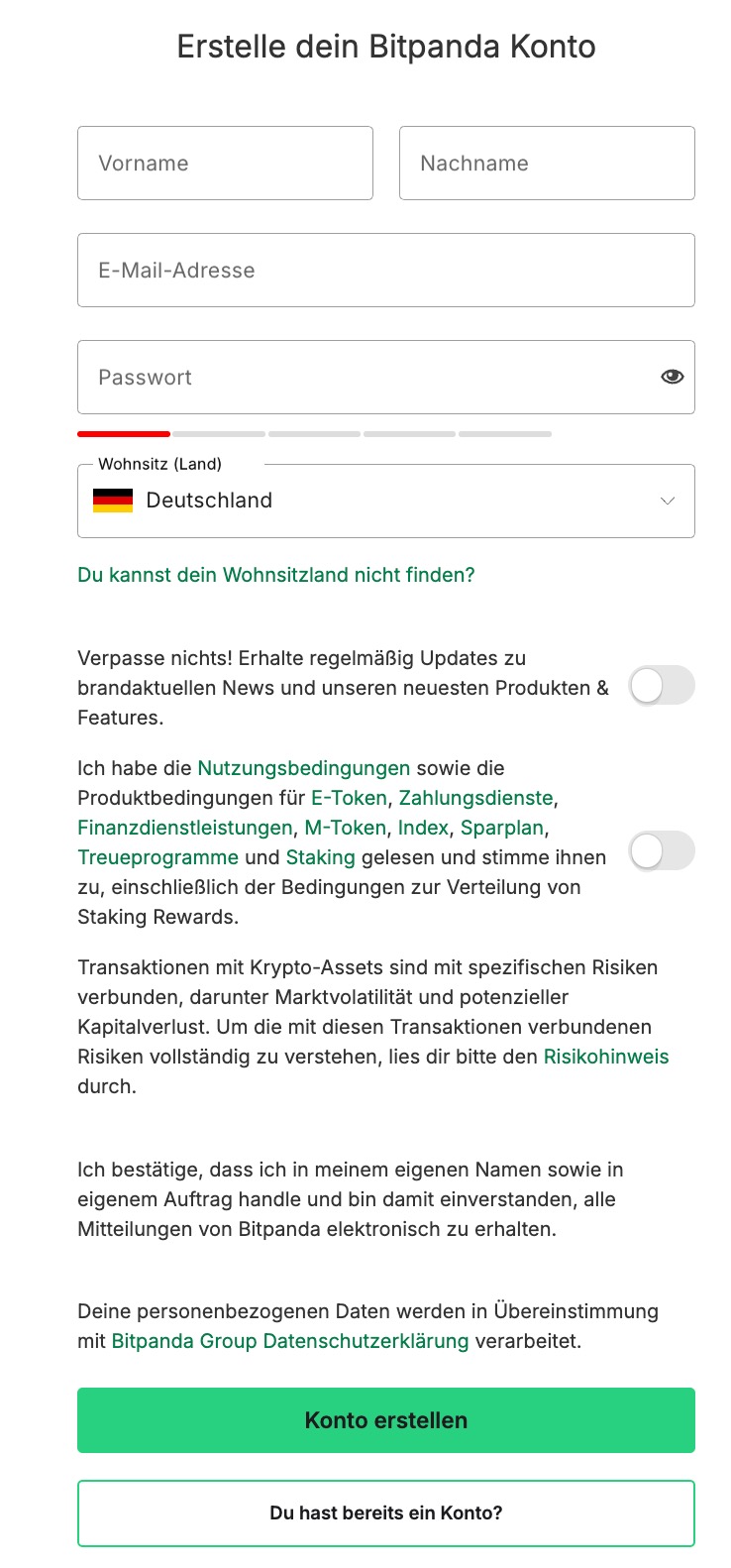 Rufe die offizielle Bitpanda-Website auf und klicke oben rechts auf „Registrieren“. Es öffnet sich ein Formular mit folgenden Angaben: